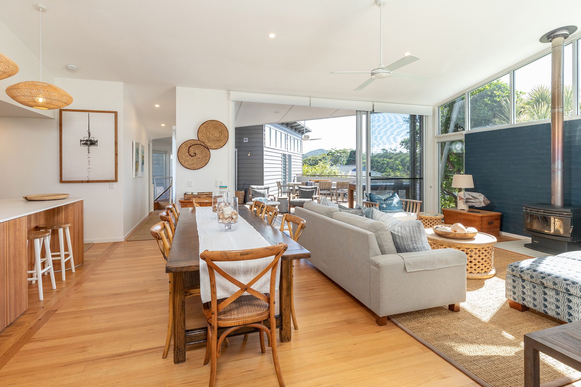 This home has wonderful open plan living & entertainment area with combustion fire and vogue décor opening to large deck with sunlounge, gas BBQ and outdoor setting. Ceiling fans in living room and 3 bedrooms.