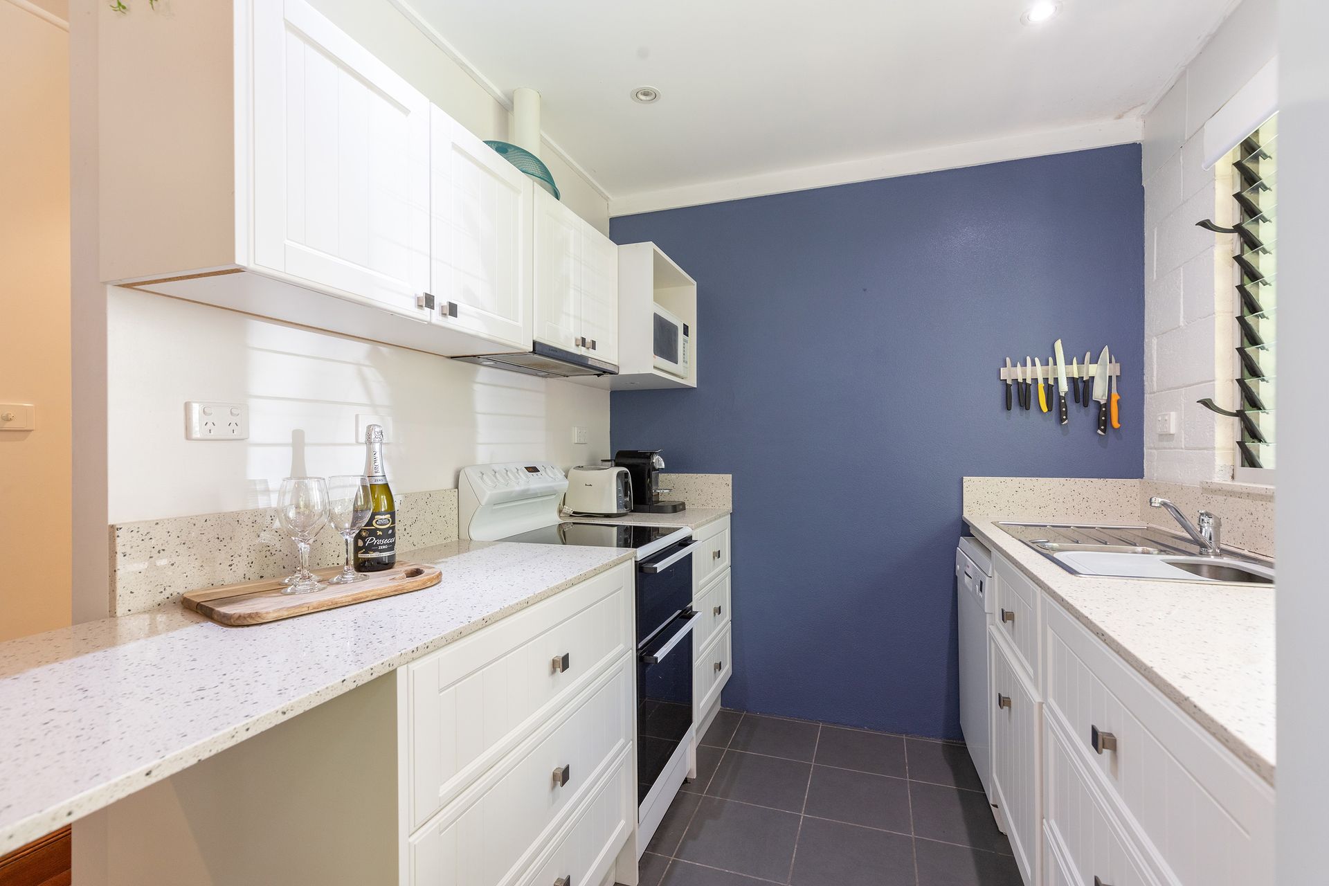 Feel the cool breeze from our air conditioning system while lounging in the living area. Air conditioning also in the 2 front bedrooms. Back bedroom with the 2 single beds has a stand fan. Make use of our TV or just retreat to the balcony, glass in hand to soak up the beach vibes. Your culinary needs are also catered for in the kitchen, furnished with essential appliances including a dishwasher, microwave oven, stove and a refrigerator. A washing machine is also provided for your laundry needs.