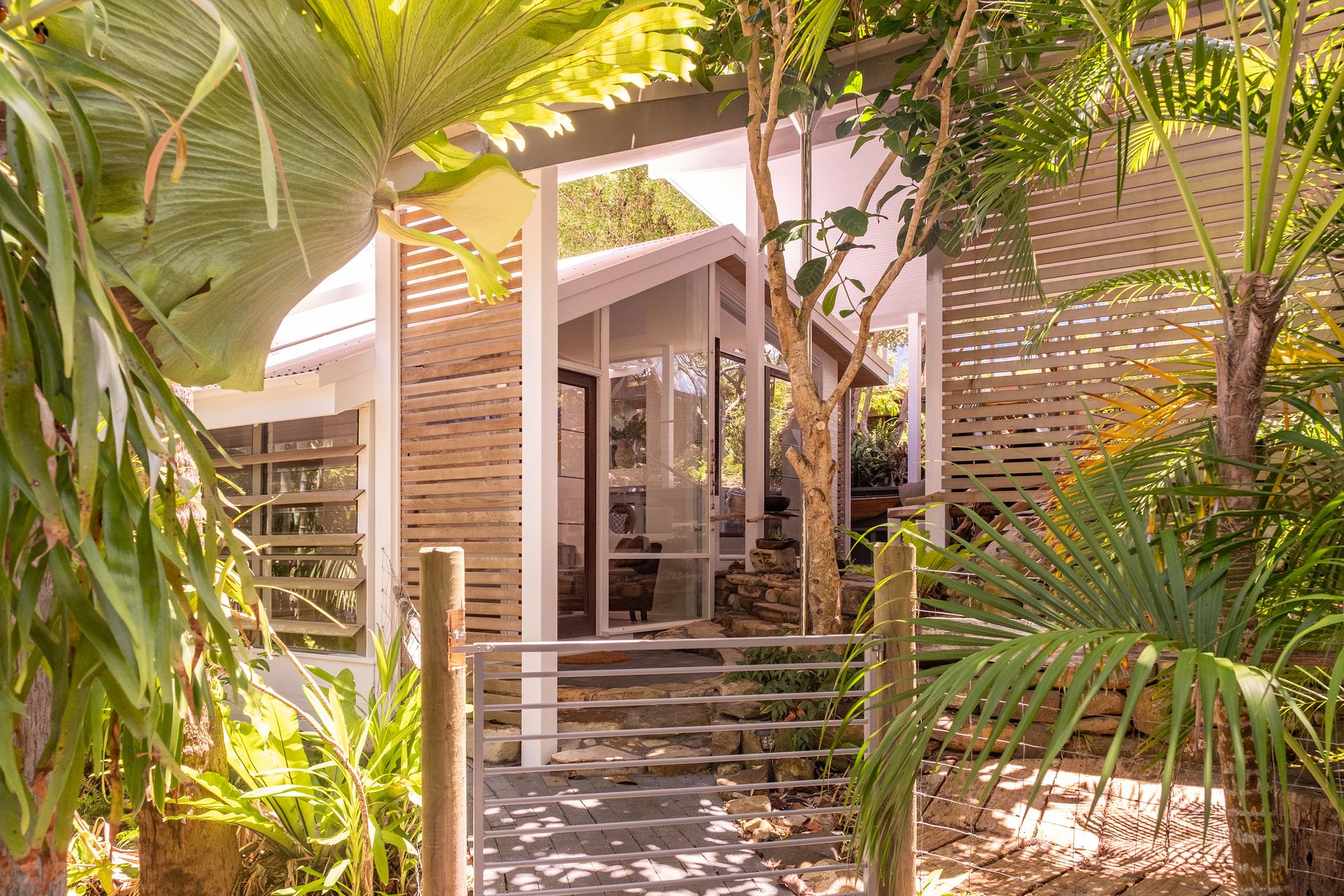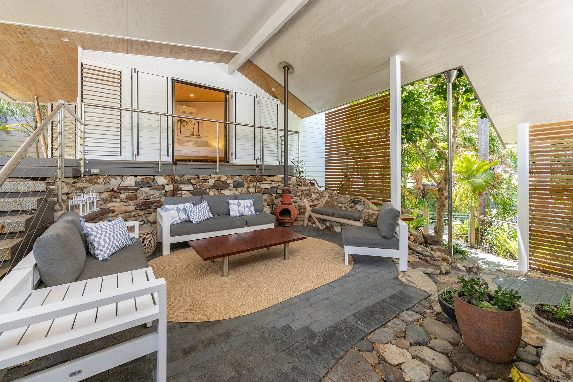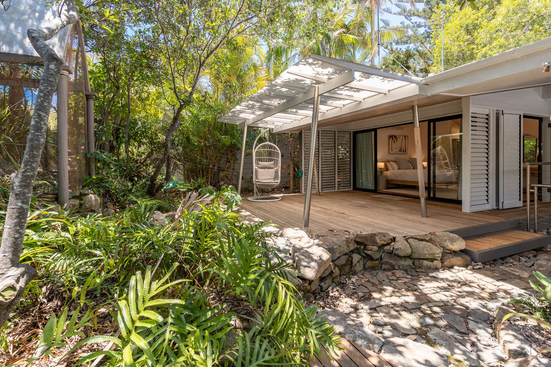 Tucked away in a cul-de-sac just moments from the sand, The Hideaway is a one-of-a-kind escape surrounded by lush, established gardens. Designed to blend seamlessly with its natural environment, this soulful retreat offers a sense of nature from the moment you arrive. Wander past calming water pond, find book nooks for reflection, and feel the creative spirit of this artist-crafted haven.