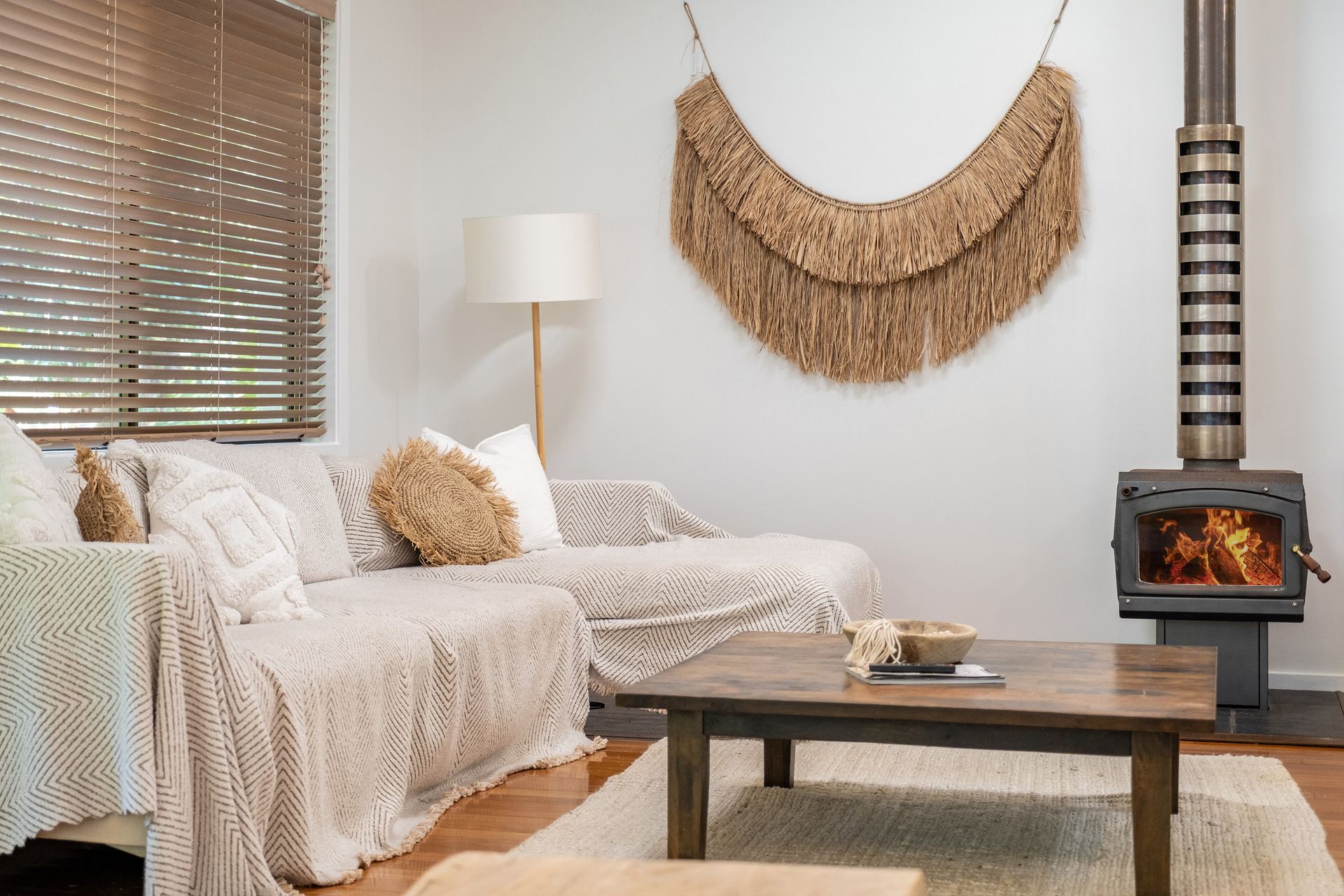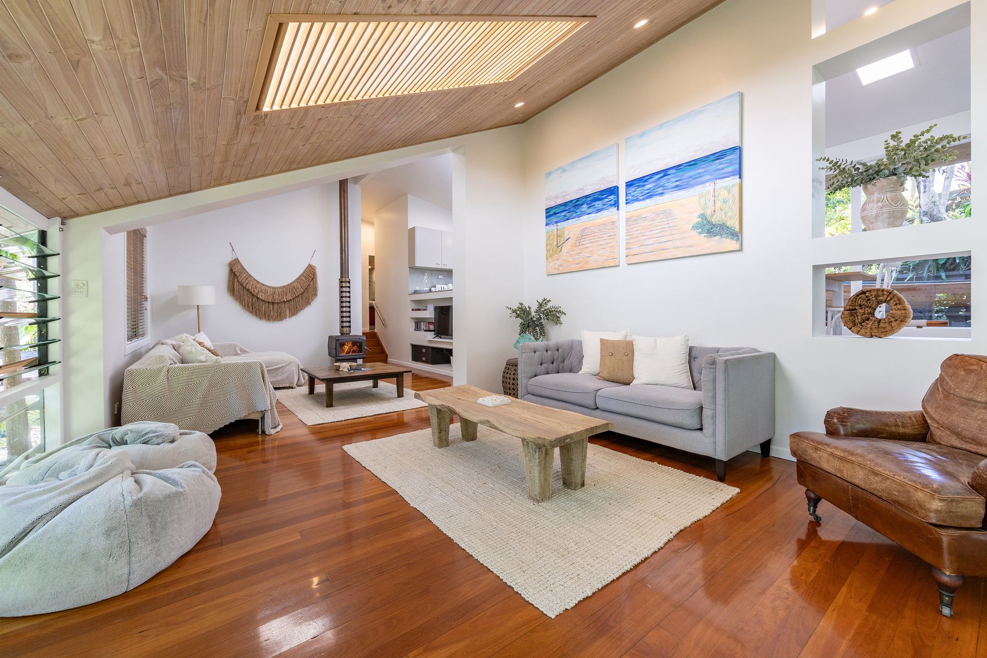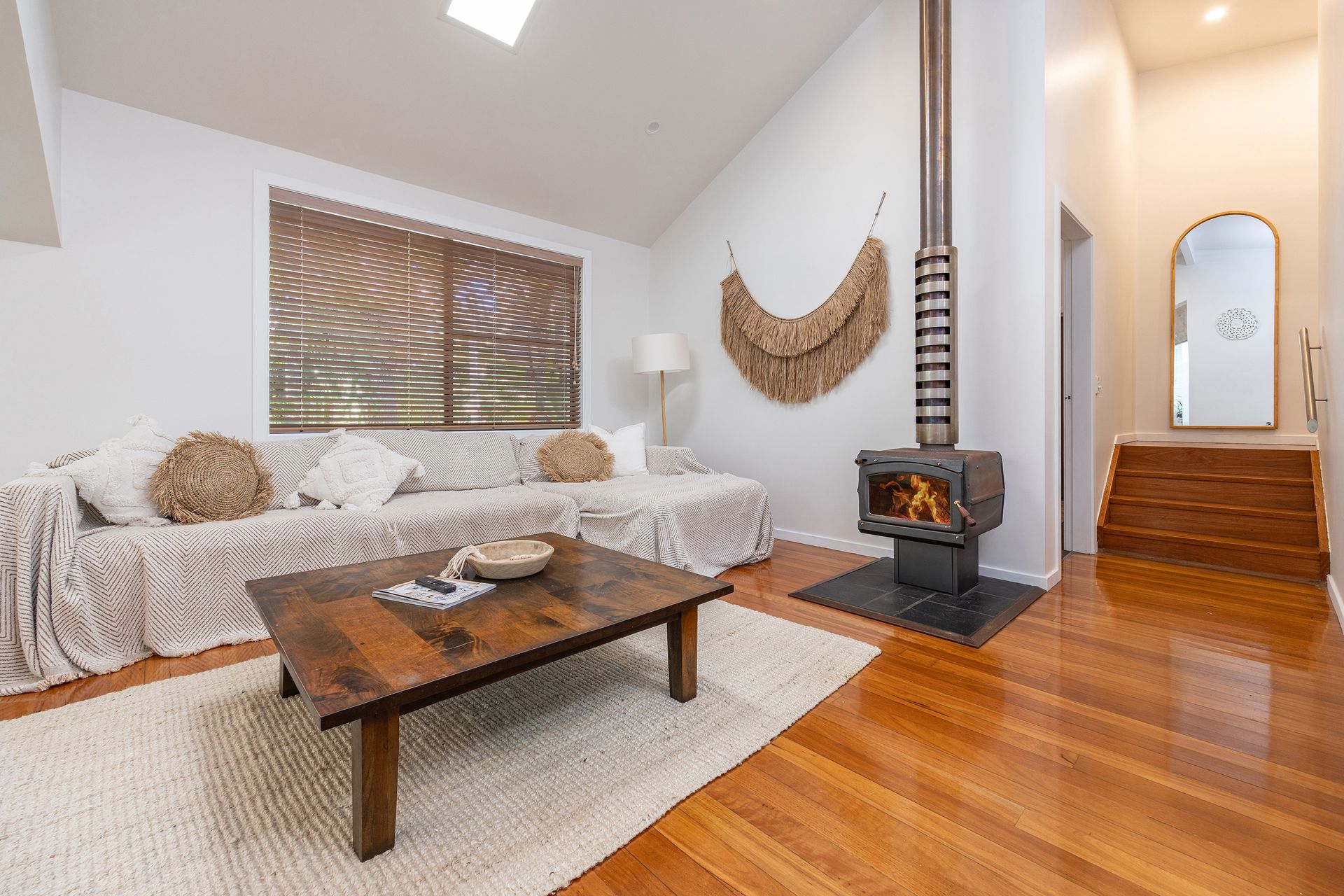 A stylish split-level, open-plan layout with hardwood floors and a cozy wood fire