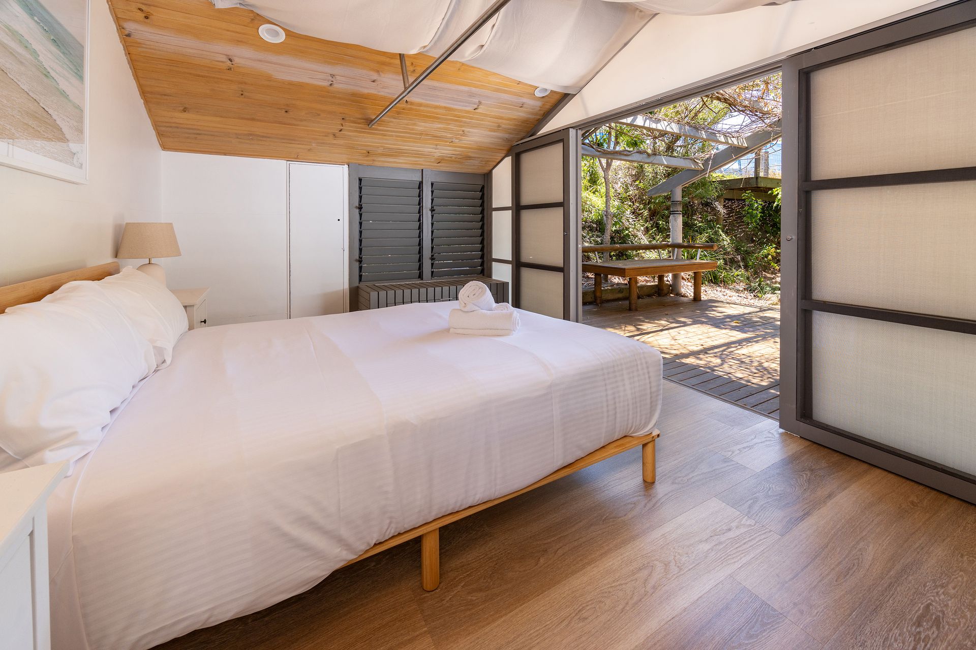 A private pavilion featuring a king bed, built-in storage, and an ensuite